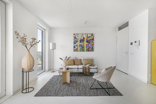 The spacious living room has a sea of light and several large windows. Besides French doors to a French balcony, you will also have access to a spacious balcony, which is also accessible from the 2nd bedroom. The balcony is located on the east and has a free and panoramic view over the park / the largest urban skate park in Europe with various sports activities. This is truly a unique view, where green and quiet walking can be alternated with dynamics and sports.